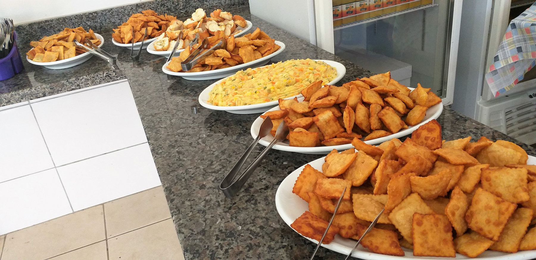 Nessa data especial tivemos pastel de queijo, carne, pizza, palmito e frango com catupiry, maionese, torrada temperada, patê e suco de laranja, brigadeiro, beijinho e bolo.